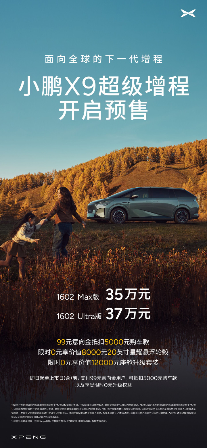 日,小鹏汽车在广州小鹏科技园成功举办小鹏X9鲲鹏超级增程技术发布会。会上,小鹏汽车正式推出全新一代增程技术解决方案——鲲鹏超级增程,终结传统增程用户面临的纯电续航短、充电速度慢、综合能耗高、亏电动力弱、增程噪音大的五大痛点,并宣布首发车型小鹏X9超级增程即日起开启预售。新车推出Max和Ultra两个版本,预售价格分别为35万元和37万元,预订可享受 99 元意向金抵扣 5000 元购车金、限时 0 元享价值 8000 元 20 英寸星耀悬浮轮毂、限时 0 元享价值 12000 元座舱升级套装,权益即日起生效至新车上市日。小鹏X9超级增程作为全球续航最长大七座,CLTC纯电续航达452km,CLTC综合续航达1602km,引领小鹏汽车开启增程全新纪元。