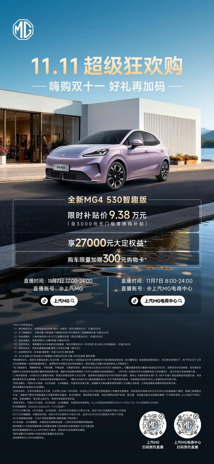 易车讯11月7日,上汽MG官方宣布推出双十一超级狂欢购钜惠,全新MG4530智趣版可享受2.7万元大定权益+限量300元购物卡。
