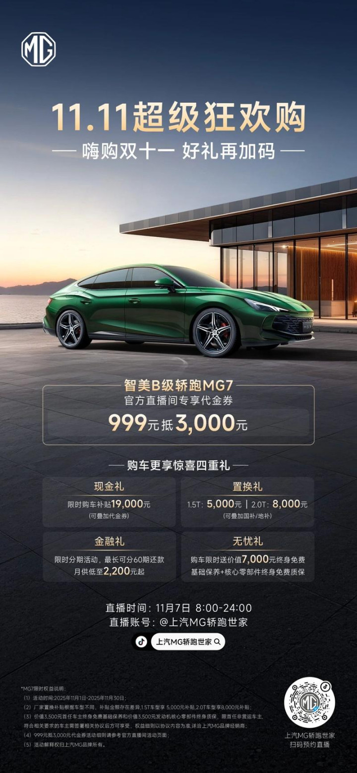 同时,MG7限时享999元抵3000元代金券,购车更可享受惊喜四重礼。